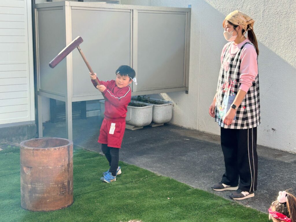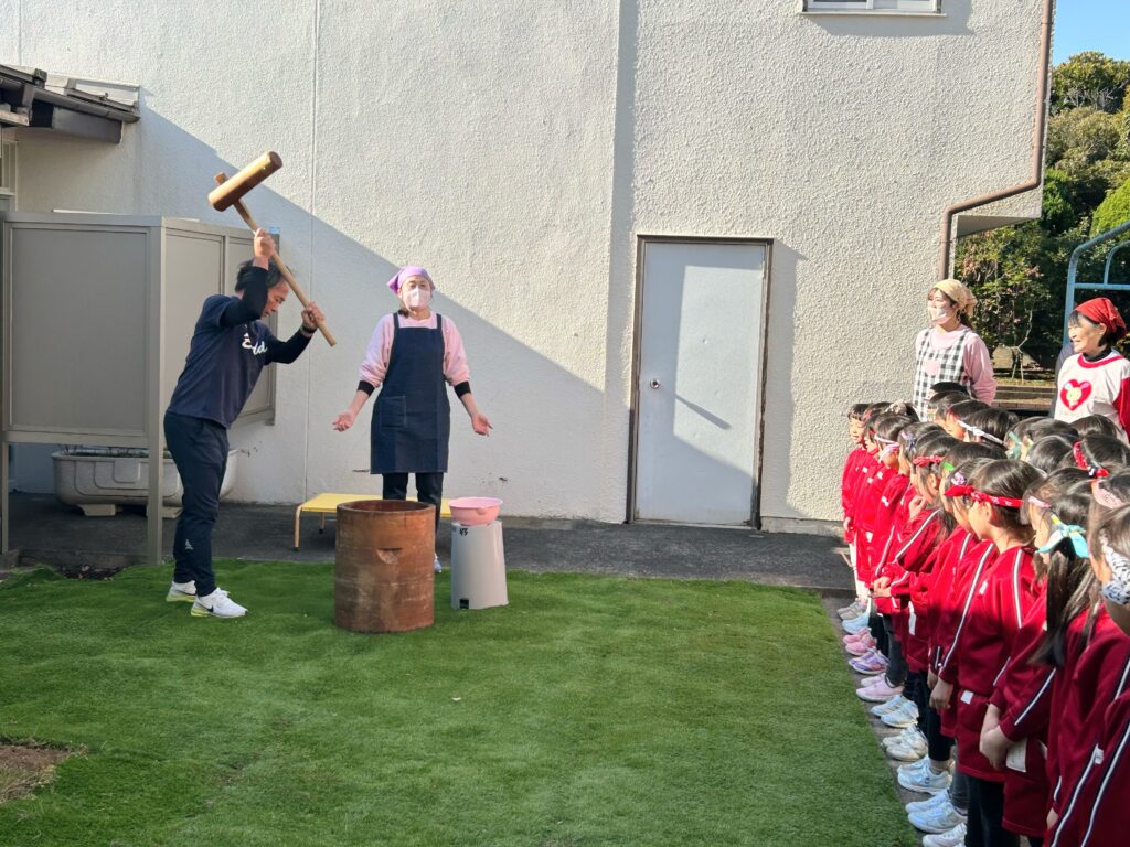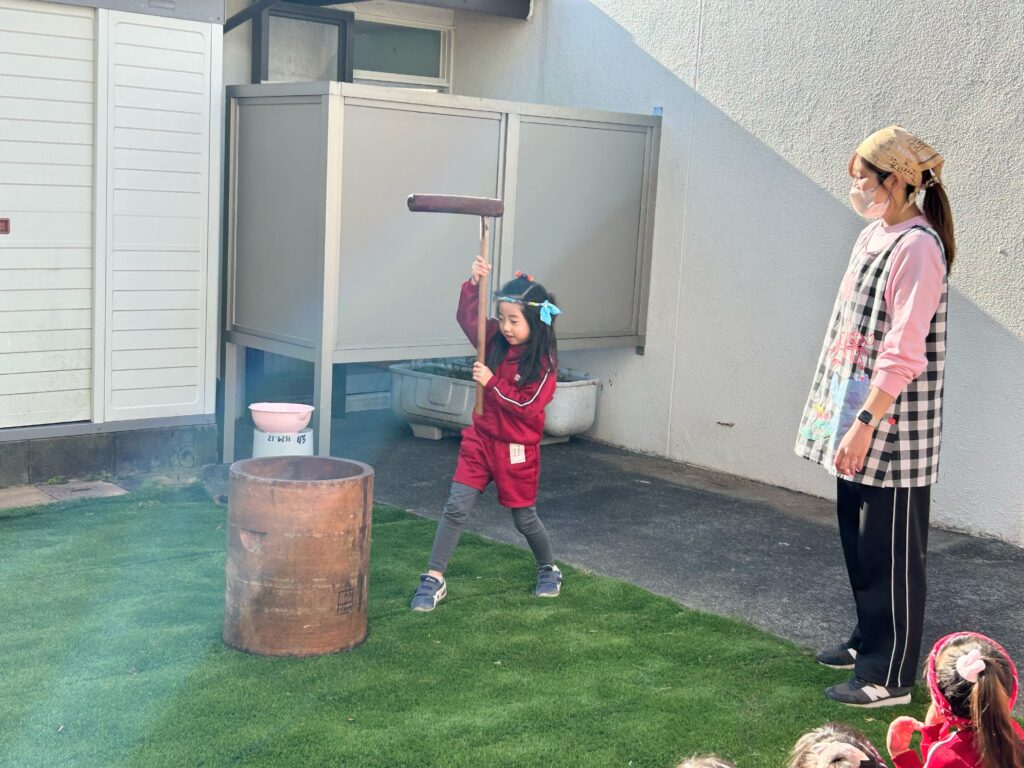 その後、子どもたち全員でお餅つきを行いました。年少さんには少し杵が重たいので、先生と一緒に挑戦しました。